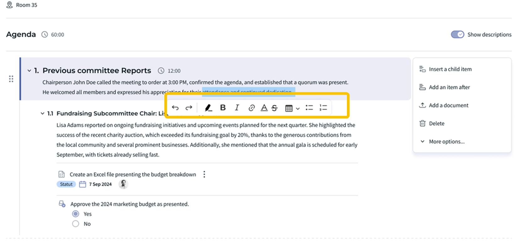 Simply click "Add an item" to add content and build the agenda. Just like any text builder, adjust text formatting for clearer, more structured agenda items, you can highlight add comments and tables. As the agenda items are synced across different views the format is kept.