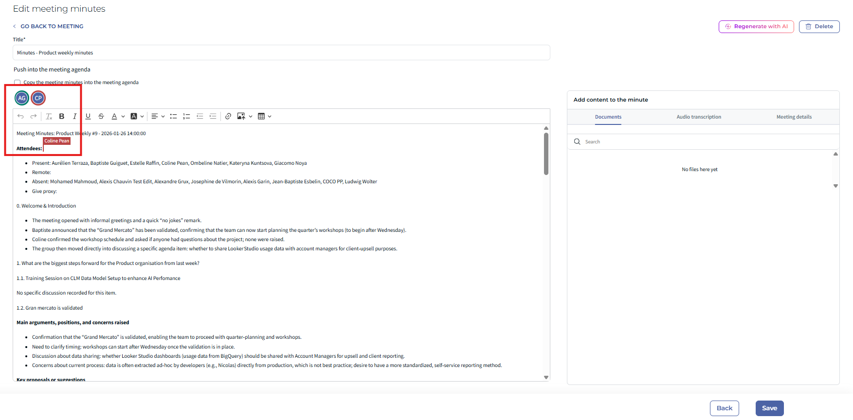 This feature allows admins and participants to personalize their meeting minutes while collaborating in real-time. You can highlight key points, add colors, insert images, and even include tables for structured information. All changes are visible instantly to other editors, ensuring smooth teamwork.