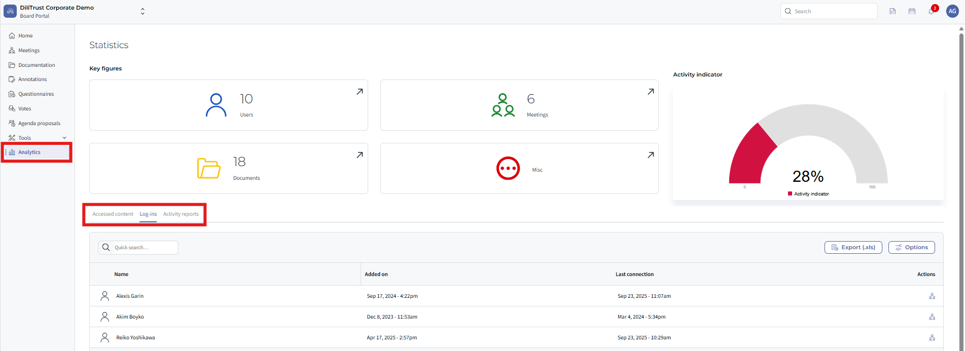 The Statistics feature in the Board Portal gives administrators and board secretaries a complete overview of how the platform is being used. It provides insights into user activity, document engagement, meeting management, and interactive features like polls and questionnaires ⚡.