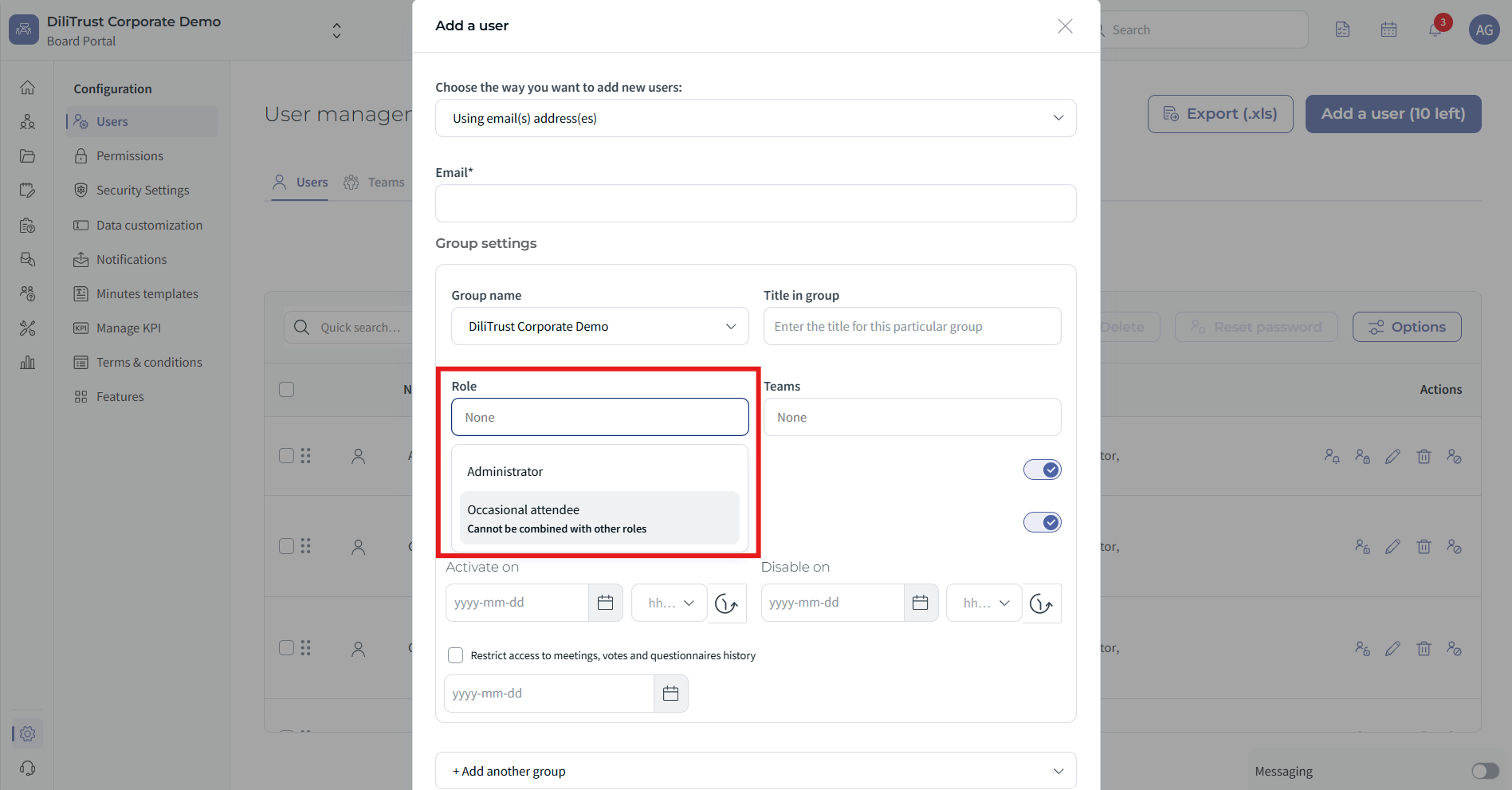 Occasional Attendees are external participants invited to specific board meetings only. They do not receive a full Board Portal account and have no visibility beyond the meetings they are invited to.
