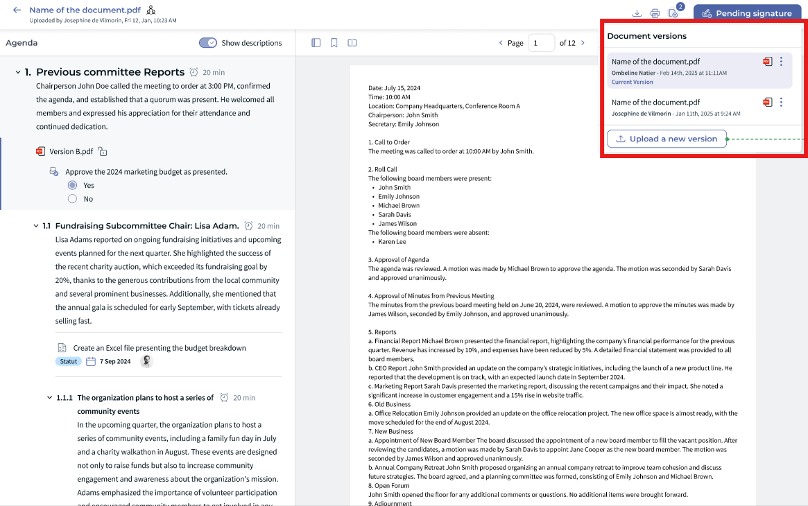 When preparing a board meeting agenda, documents are often updated multiple times — sometimes right up until the day before the meeting. The Document Versioning feature ensures that all participants always access the latest version, while keeping visibility on changes and preserving annotations ✍.